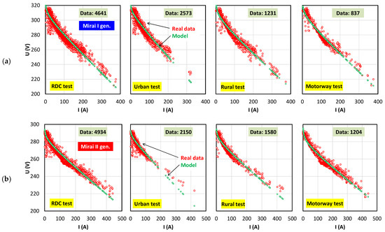 Current–voltage characteristics of the fuel cell stack of hydrogen-powered drives with modeling results: (a) I generation FCHEV drive; (b) II generation FCHEV drive.