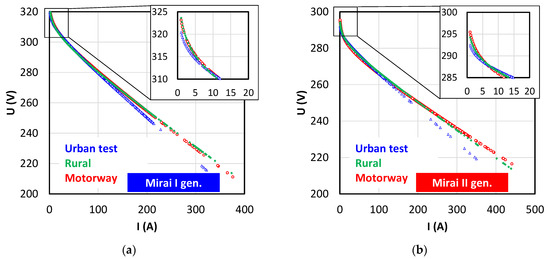 The open circuit voltage changes in a similar way. For both drive system generations the lowest Eoc values were obtained in urban driving conditions (Figure 18). For rural conditions, the maximum Eoc values were obtained for the Mirai I gen. vehicle. For motorway conditions, the highest Eoc value was obtained for the newer generation drive—Mirai II gen. The data contained in Table 4 confirm these values. Additionally, Eoc in the case of the second-generation drive was about 0.5 V greater. In accordance with the previous provisions (Section 3), this voltage does not affect the values of the fuel cells losses.