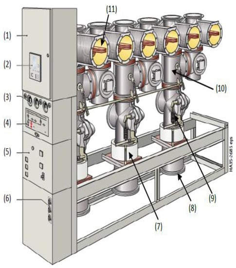 Figure 5. Example of GIS. 1. LV compartment. 2. Relays. 3. Gas density meter. 4. Single line diagram/semaphore indication. 5. CB operating mechanism. 6. Live indicator. 7. Current transformer. 8. Cable termination. 9. Circuit breaker. 10. Disconnectors/Isolators. 11. Busbar in SF6.