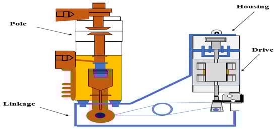 The main responsibility of the circuit breaker in the switchgear is to safeguard the electrical current by stopping current leakage and isolating damaged components from the power grid. The breaker is often divided into four subsystems from a mechanical standpoint: drive, linkages, pole, and enclosure (Figure 6). In application fields, whereby the drive sub-system is the source of energy used in a close and open operation, mechanisms that are driven by spring are commonly adopted. The interval between the transmission drive and the pole involving the electrical connections that limit the fault currents is represented by the linkage. The motor and connection are contained in a metal box, and the pole is insulated with a special substance. A recent examination of electrical component failure statistics in an MV distribution network [14,15] has demonstrated that in MV switchgear, the breaker is the principal component that is prone to failure. Mechanics are the cause of about 90% of all breaker problems, which can cause problems with the breaker motor and working mechanism [15].