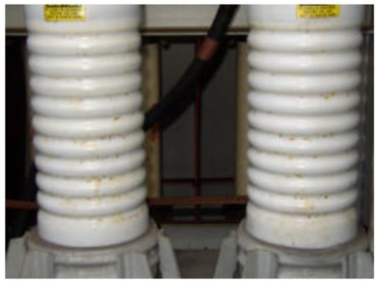 • Busbars are close to the insulator material, and contamination is present on ceramic (an example is shown in Figure 10, [36]).
