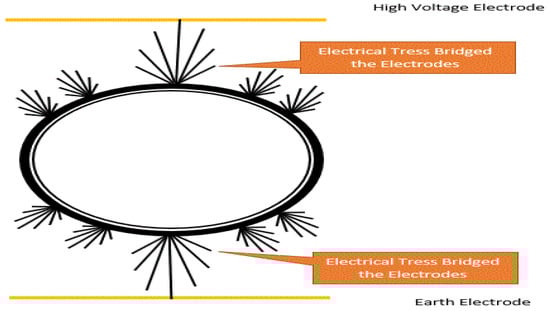 Corona is the faint light that surrounds an electrical conductor caused by the ionization of air when nitrogen in the air breaks down. When nitric acid is mixed with moisture, nitric acid is produced. This acid also destroys insulating materials and metallic mechanisms, potentially causing heat difficulties. The most hazardous element is that it occurs without causing a flashover because corona formation happens when nearby air is strained past its ionization threshold and occurs virtually quietly. When electrical stress surpasses the insulative properties of air (as illustrated in Figure 7), the air across the layers of the insulating becomes charged. Corona finds its way to Earth, as seen in Figure 7 [30,31].