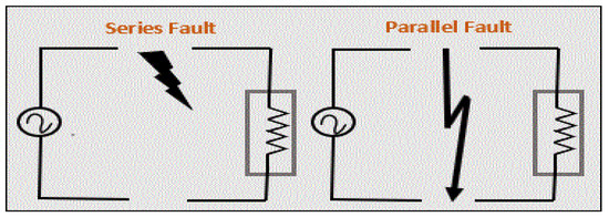 As a result, (1) the fault happens in series with the load, and (2) subsequently, the fault arises across conductors of different polarity (parallel fault shown in Figure 15), broken wiring overheated or strained electrical cables, aged electrical insulation, cables and/or wires in interaction with vibrating metals, damaged electrical equipment, and other causes that may all cause these failures. The resistance of the load helps keep the current in the series arc fault shown in Figure 15 from being too high [45].