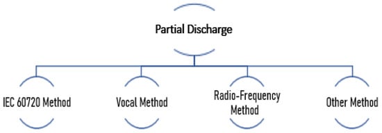 Various sensing modalities have been investigated to monitor PD activities, including electric charge impulses, chemical changes, acoustic pressure wave emissions, and electromagnetic wave radiation. These PD-generated products may be monitored and studied using a variety of sensors and signal processing methods. To achieve adequate monitoring performance, a variety of approaches that involve electrical systems, according to the International Electrotechnical Commission (IEC) 60270 standards and other non-conventional approaches, have been developed and used for PD testing. These approaches may be categorized as offline or online detection methods depending on how they are measured. As opposed to offline monitoring, online monitoring is gaining popularity since it minimizes power interruptions and less disruption to the system’s performance. Figure 16 introduces and summarizes these approaches to PD data collection detection [58].