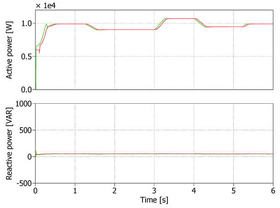 Active and reactive powers comparison: Red color denotes PI&PLL, while the green color denotes CVF.