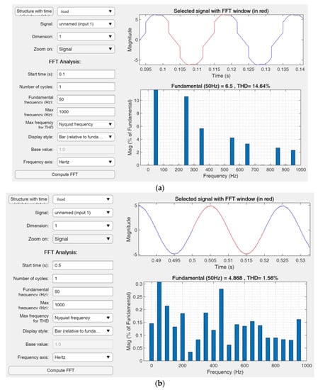 Figure 9a,b depicts the harmonic performance before and after the CVF application. Herein, the load current THD is reduced from 14.64% to around 1.56% in the utility grid current, knowing that in [], the total harmonic distortions value of the waveforms is 2.08%. The non-linear load value has been set according to the recommendation in the standard IEC 62040 []. Accordingly, the non-linear load active power is set to around 60% of the rated power of the inverter. The values of the THD in each reference cannot be clearly compared unless they are implemented on the same system and under the same conditions.