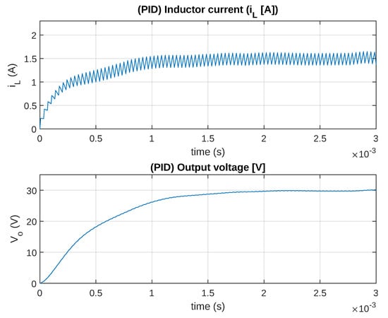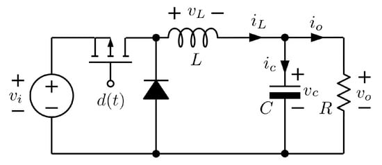 The Buck converter is a DC/DC step-down converter, ubiquitous with DC power supplies for electronic equipment. A pulsed input voltage passes through a low-pass filter to generate the output voltage, which is controlled by a PWM signal that switches the MOSFET [47]. When in steady-state, the input-to-output ratio is given by Equation (1):