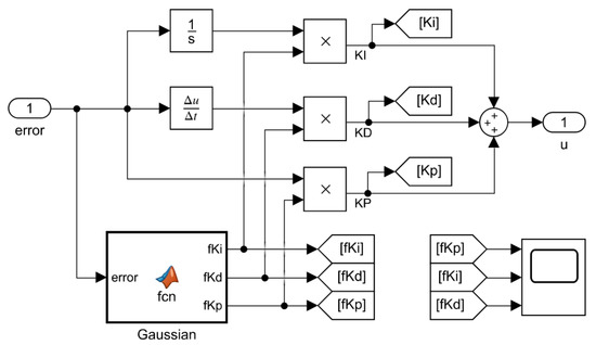 The GAPID control, proposed by [43], also explored by Borges et al. [44] and later by Puchta et al. [45], is an Adaptive PID system where each one of the three PID gains (, , and ) changes depending on three distinct Gaussian curves and the current error, as shown in Figure 3.