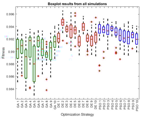 - The initial inertia variation with global topology (PSO 2) offered the highest fitness values for PSO strategies, but analyzing the Dunn–Sidak correction, this variation can be considered tied in efficiency to PSO 5 and PSO 7.