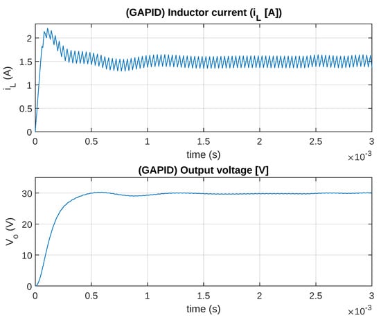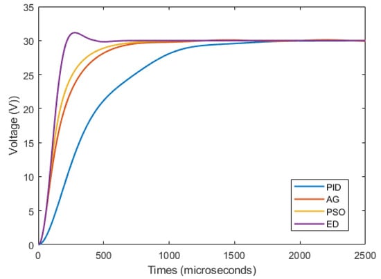 In this sense, in [43], the authors presented six variations of genetic algorithms for tuning the GAPID and showed good enhancement of GAPID over traditional PID. The authors in [44] did the same six variations but with PSO, which also demonstrated good enhancements of GAPID over PID. These two optimization algorithms also were employed in [17], which were used in a plant based on a step-down DC–DC converter, and compared, demonstrating promising results and a slight advantage for PSO. The latter also presented faster convergence and lower computational cost; however, on the other hand, the agent positions on the last iterations were very concentrated, representing a low search capacity, and possibly converging to a sub-optimal solution instead of the global one.