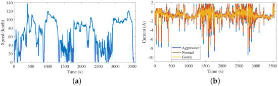 The power levels required for normal and gentle drivers’ accelerations and decelerations are lower compared to those of the accelerations and decelerations recorded for the aggressive drivers. Thus, the aggressive drivers’ accelerations needed to be scaled to represent the accelerations for normal and gentle drivers. Six representative drivers, two from each category, were used, where the mean of the maximum acceleration for each trip was used to calculate the scaling factors. Based on these, the normal drivers’ acceleration was 85% of the aggressive drivers’ acceleration. The gentle drivers’ acceleration was found to be merely 32% of the aggressive drivers’ acceleration. The power required for the acceleration was scaled according to these values, and the maximum discharge current for the normal driver was 8.6 A and for the gentle driver 3.7 A. Thus, the reader should note that it is not possible to achieve the speed profile in Figure 2a using the current profiles for normal and gentle driving (Figure 2b).