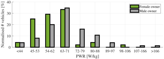 Figure 3 shows the PWR distribution normalised over the number of vehicles in each gender group. The most common PWR range was 63–71 W/kg, with 35% of the male- and 33% of the female-owned vehicles. However, the majority of female-owned cars had a PWR lower than this and the group had a mean value of 59 W/kg, compared to 68 W/kg for the male-owned vehicles. This is also confirmed when looking at the choice of vehicle model: more men than women owned performance and high-end vehicle models.