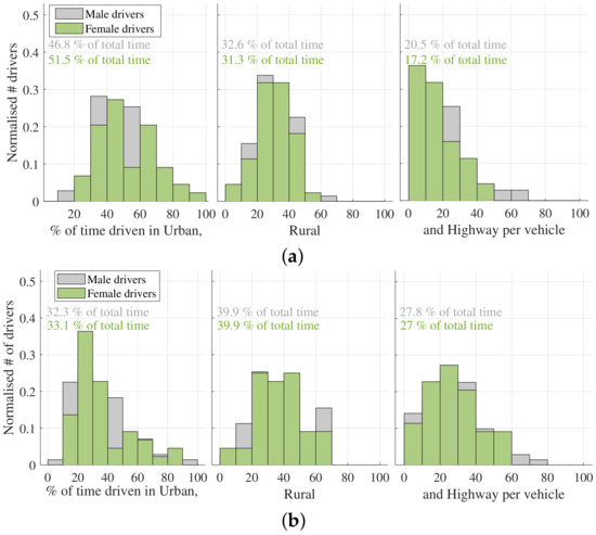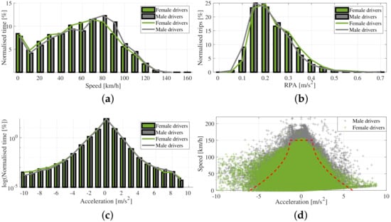 Speed and time distributions were generated for the two genders by separating data into male and female drivers (Figure 4a). The distributions show that the male drivers’ speed distribution is skewed to higher speeds compared to the female drivers’. For the women, the distribution peaks at 70 km/h, while for the men, the peak is at 80 km/h.