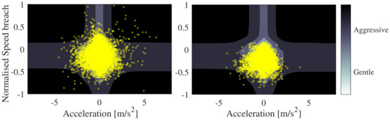 A visualisation of the results of the algorithm can be seen in Figure 6. For pedagogical reasons, the outlier plot is in a two-dimensional space and the total dimension of the data set is a five-feature hyperplane. The reported ML approach is intrinsically scalable to higher-dimensional data. The contour background is generated by the algorithm and gives an estimate of the driving style: the lighter the colour, the gentler the driving style is; the darker the colour, the more aggressive the driving style is. As can be seen in Figure 6, the zones identified by the SVM algorithm managed well to capture the driving style. The yellow circles represent a registered driving point, to the left an aggressive and to the right a gentle driving style.