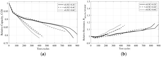The lifetime testing was separated into two test batches, where all tests were charged with 0.5 C CC-CV. The first group tested with CC discharge cycles from 0.2 C to 0.6 C, representing different power demanding driving cycles, was only applied to the MJ1 cells. For the CC tests, the expected results of increased ageing for increased C-rate were observed (Figure 7). However, the large spread between the duplicate cells was unexpected. It is not uncommon to see a small spread in performance for mass-produced cells; however, the spread seen for the MJ1 cell was surprisingly large. Spread in cell performance has been reported by other researchers [39,40,41,42]. The large spread made the analysis more difficult; however, for tests with increasing C-rate, the expected increase in cell ageing could be seen.