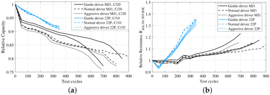 In the second test batch, with the dynamic current profiles described in Section 2.2.2, both MJ1 and 22P cells were included. This test was designed to investigate how the transient current amplitude, due to acceleration and deceleration, impact the battery ageing. Again, MJ1 cells displayed a large spread between duplicates (Figure 8). Still, cells tested with the aggressive driving cycle showed a larger loss of capacity than those with the normal and gentle driving cycles. Surprisingly, cells tested with the gentle driving cycle had a larger resistance increase (Figure 8b). For 22P cells, much more uniform ageing behaviour between the duplicates was seen. Contrary to MJ1 cells, there could not be seen any difference in the ageing trends due to the transient current amplitude (Figure 8a). If any, the normal driver case introduced a marginal resistance increase; however, the difference was too small to draw any conclusions from.