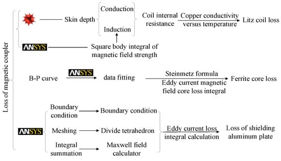 In this article, the loss values of the litz coil, ferrite core, and shielding aluminum plate in the magnetic coupler are calculated. The calculation process and method are shown in Figure 1.