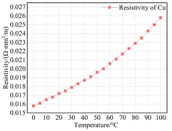 The system’s temperature will rise when working, resulting in changes in material parameters. For litz coil, its interior is mainly composed of copper. When the temperature increases, it can be seen from Formula (8) that the conductivity of copper decreases. Figure 4 shows the change curve of copper resistivity with temperature. It shows that the resistivity of copper with temperature can be approximated as a first-order function between 0–100 °C. The relationship can be substituted into Formula (8) to obtain the litz coil loss calculation formula considering the temperature effect, as shown in Formula (10).