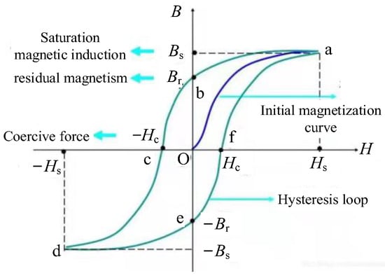 The loss of the ferrite core Pcore consists of three parts, the hysteresis loss Ph, the eddy current loss Pe, and the residual loss Pex. The hysteresis loss can be expressed by the hysteresis loop, as shown in Figure 5. The area enclosed by the curve in the figure is the hysteresis loss, which is finally dissipated in the form of heat.
