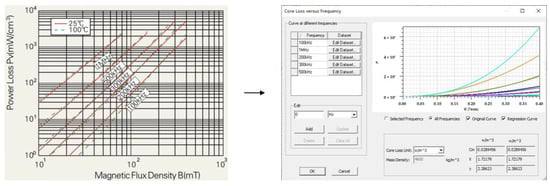 Equation (12) is the Steinmetz formula. Cm, α, and β is the Steinmetz coefficient obtained by fitting the loss value under sinusoidal ac excitation at different frequencies. In general, the value range of α is 1 to 2, and the value range of β is 2 to 3. The core loss can be calculated by inputting the B-P curve values under different frequencies into ANSYS Maxwell according to the material properties, as shown in Figure 6.