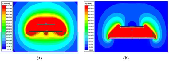 Cloud diagram of the magnetic induction intensity distribution in the magnetic coupler under different conditions. (a) Magnetic induction intensity distribution without aluminum plate; (b) magnetic induction intensity distribution with aluminum plate.