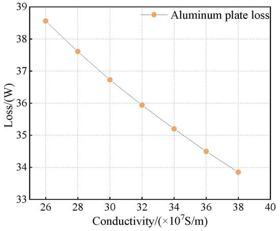 According to (18), it can be concluded that the eddy current loss of the aluminum plate gradually increases with the decrease in its conductivity σ. The aluminum plate loss of different aluminum plate conductivities is shown in Figure 9.