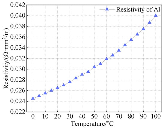 The resistivity of aluminum increases with the increase in temperature. According to (18), it can be concluded that the loss of the aluminum plate will increase. The change of aluminum versus temperature change is shown in Figure 12, similar to the curve of resistivity of copper versus temperature. It can be approximated into a first-order function, and the expression can be substituted into (18) to obtain the loss calculation formula for shielding aluminum plates.
