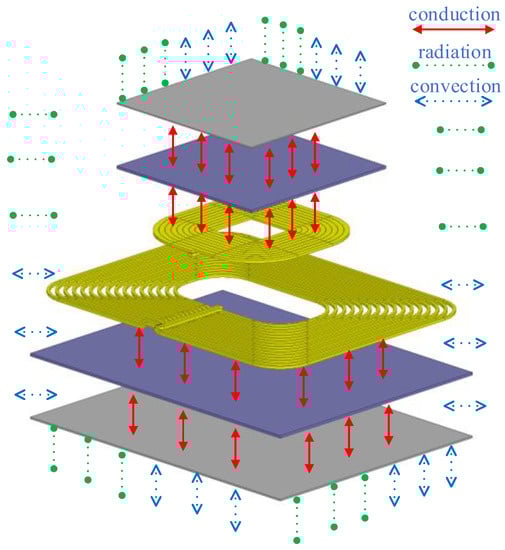 In the process of temperature rise, due to the effects of three heat transfer modes: heat conduction, heat convection, and heat radiation, the temperature of each part of the magnetic coupler tends to be stable, reaching a thermal equilibrium state. The schematic diagram of the heat transfer mode is shown in Figure 13.