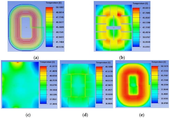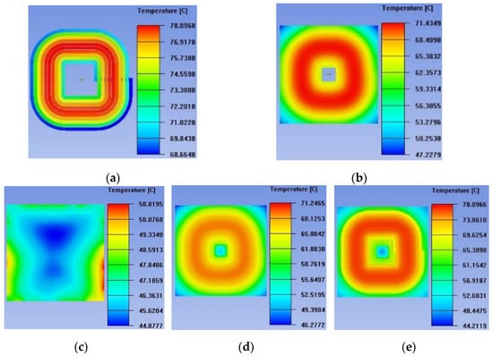 Eddy current magnetic field and thermal field simulations are conducted for the magnetic coupler of a 6.6 kW electric vehicle wireless charging system. A thermal field simulation for the magnetic coupler’s heat generation is shown in Figure 14 and Figure 15. The simulation results are presented in the form of temperature distribution. (a), (b), and (c) show the coil, the magnetic core, and the aluminum plate temperatures. In addition, the magnetic coupler’s mechanical structure includes a coil tray and a cover plate. They have no electrical properties and do not generate heat. Their temperature distributions are shown in (c) and (d).
