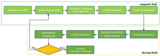 The magnetic coupler’s thermal design steps are shown in Figure 16. First, the geometric model of the magnetic coupler is established. Then, the material properties are determined in the magnetic field, the boundary conditions are set, and the mesh is divided. The losses of each part of the coupler are obtained based on the eddy current magnetic field control equation. After that, the loss is brought into the thermal field. The thermal field’s material properties are determined, the boundary conditions are set, and the mesh is divided. The temperature of each part of the magnetic coupler is obtained based on the governing equation of the thermal field. Finally, loop iteration until convergence. This section will research different heat dissipation methods based on this process.