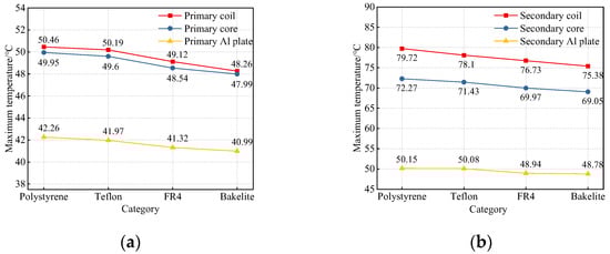 Variation of the maximum temperature of each part of the magnetic coupler with supporting material. (a) Primary magnetic coupler; (b) secondary magnetic coupler.