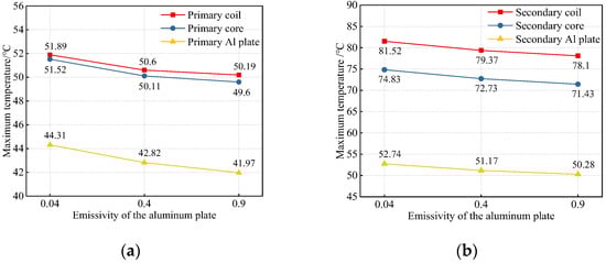 Variation of the maximum temperature of each part of the magnetic coupler with emissivity of the aluminum plate. (a) Primary magnetic coupler; (b) secondary magnetic coupler.