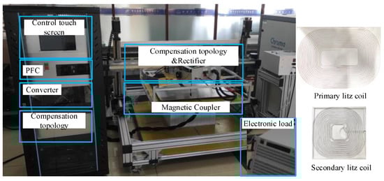In order to verify the accuracy of the loss calculation and the effectiveness of the heat dissipation scheme, a 6.6 kw electric vehicle wireless charging experimental platform is built. The physical diagram of the experimental platform is shown in Figure 19. The experimental platform includes power factor correction (PFC), a primary inverter, compensation topology, a magnetic coupler, a secondary rectifier, an electronic load, and control operation equipment.