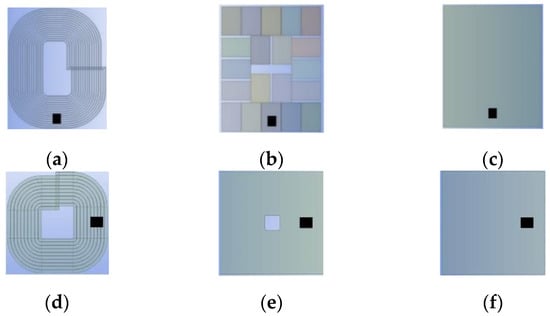 Embedded position of thermocouple sensors. (a) Primary coil; (b) primary magnetic core; (c) primary aluminum plate; (d) secondary coil; (e) secondary magnetic core; and (f) secondary aluminum plate.