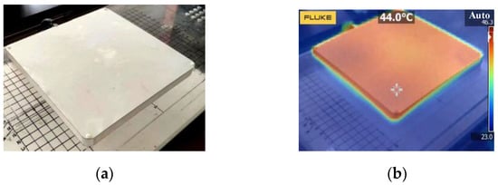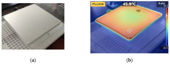 The temperature of secondary shielding aluminum plate coated with thermal conductive silicone grease. (a) Shielding aluminum plate coated with thermal conductive silicone grease; (b) temperature value and distribution.