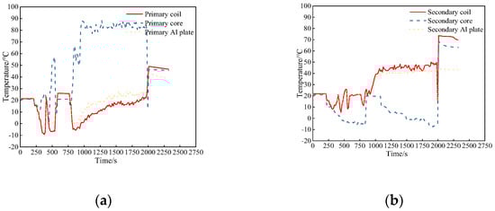Temperature curve of each part of the magnetic coupler. (a) Temperature curve of each part of the primary side; (b) temperature curve of each part of the secondary side.