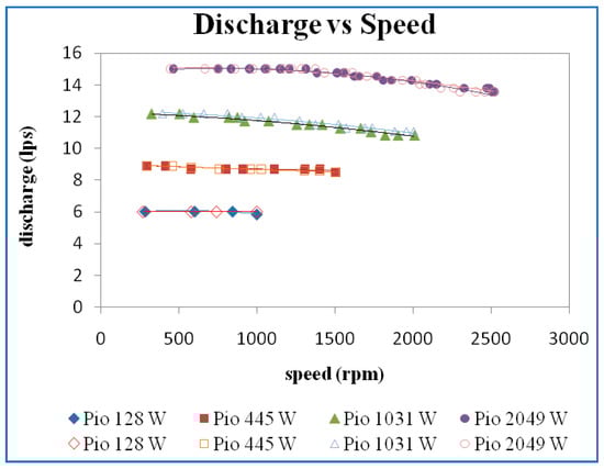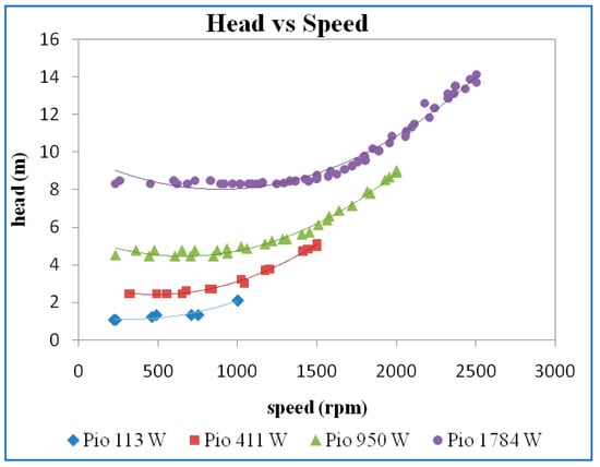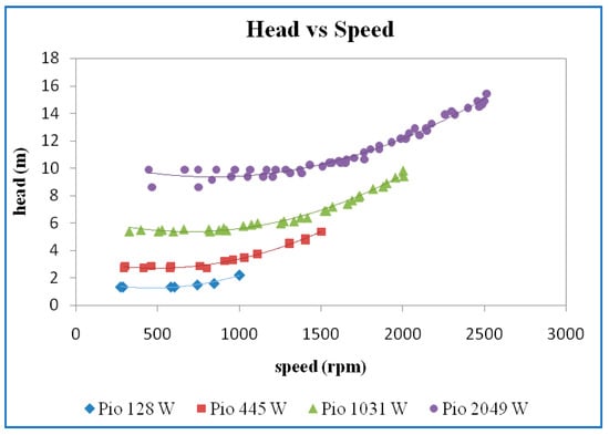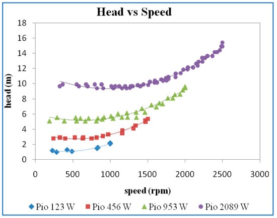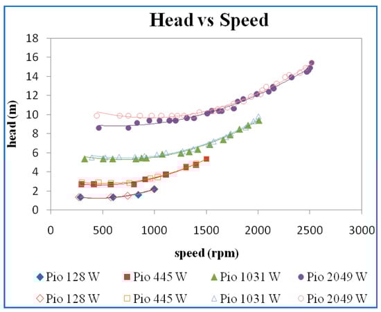 Figure 5 shows the plot of the variation of the head concerning the speed for different power inputs. The head increases with an increase in the power inputs. The head is almost constant at lower speeds and then increases with speed. There is a slight increase in the head curves even during the lower speeds for the power input of 2049 (W). In this plot also, it may be observed that the repeatability of the readings is good.