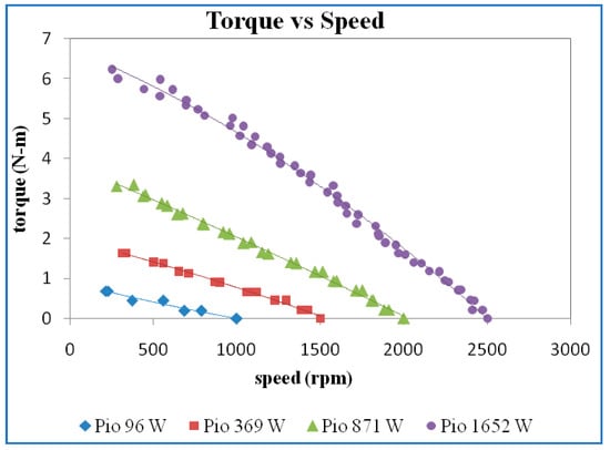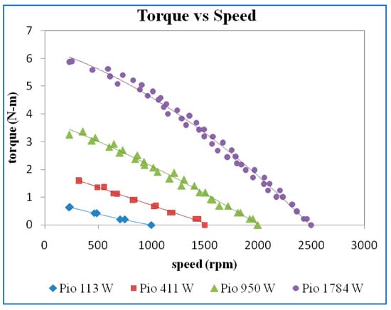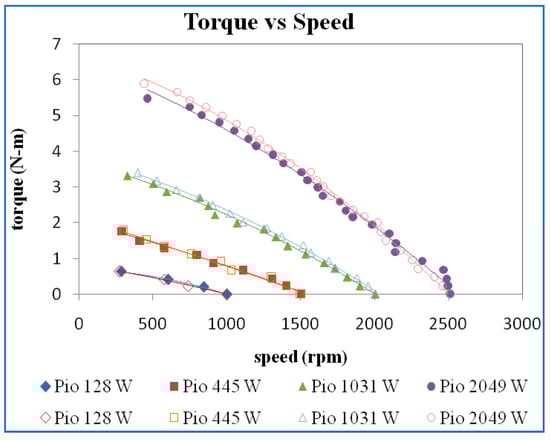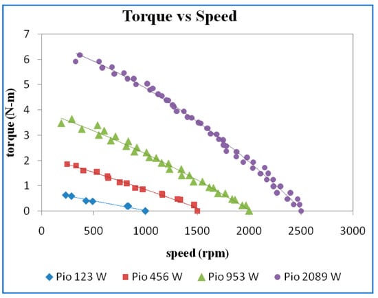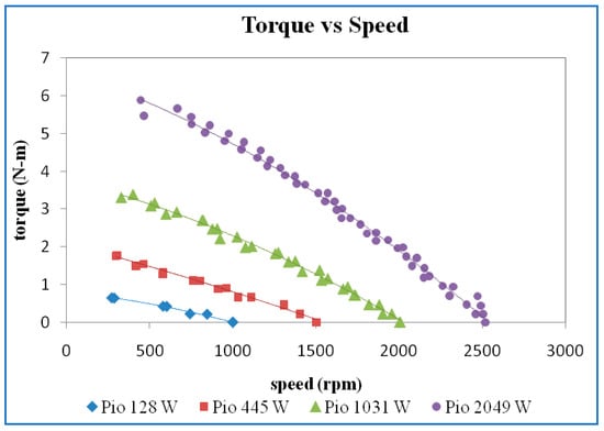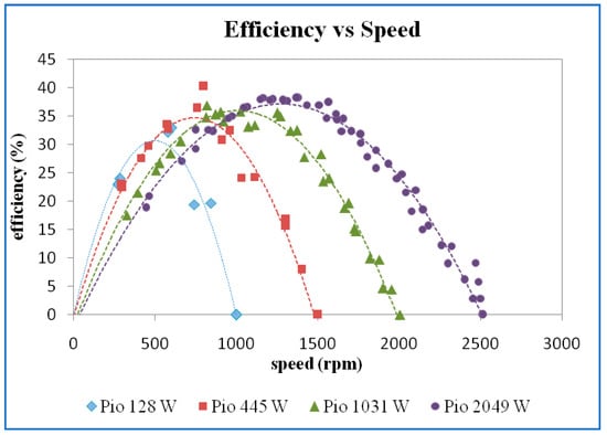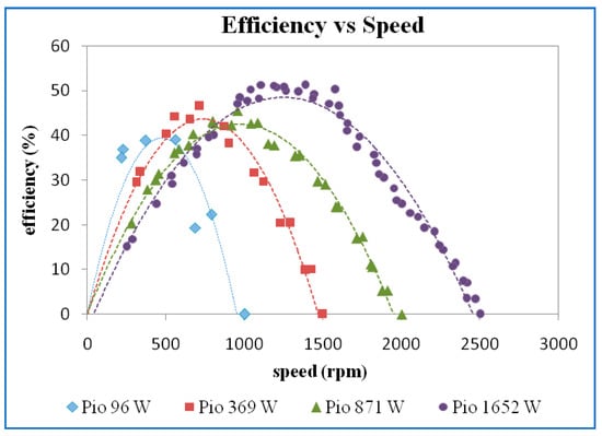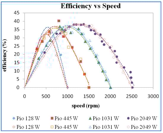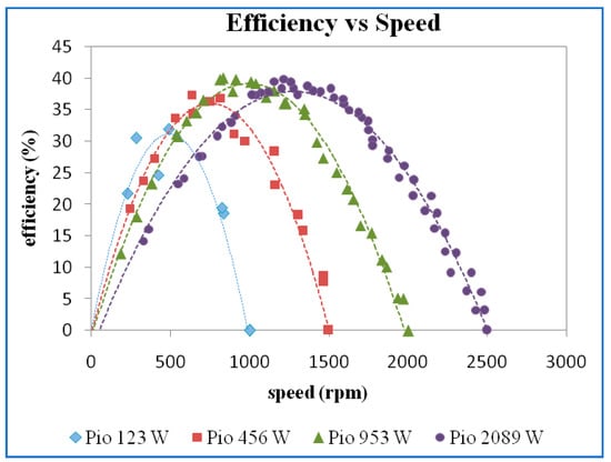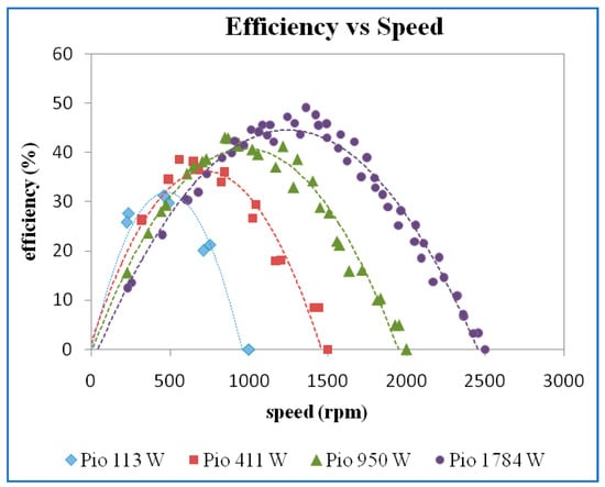 The efficiency versus speed for different power inputs is shown in Figure 10. The higher maximum efficiency was obtained for higher input power. However, there is only a slight variation of maximum efficiency at 445 W, 1031 W, and 2049 W input power.