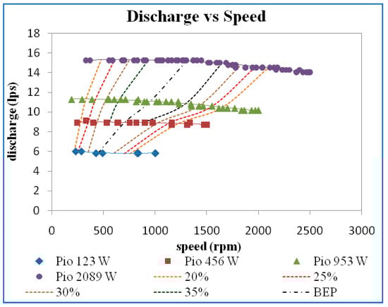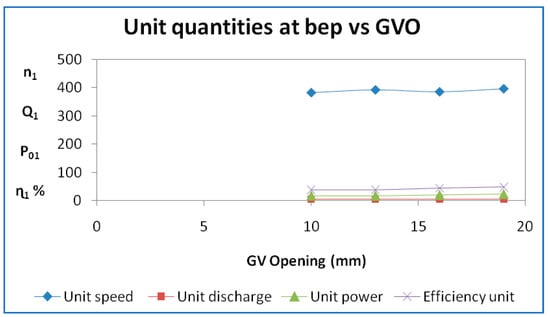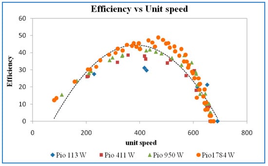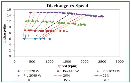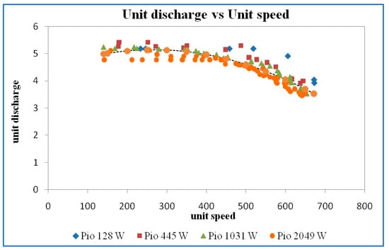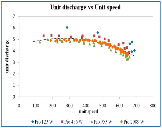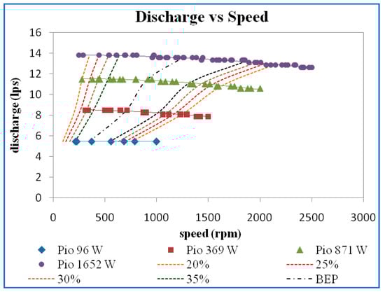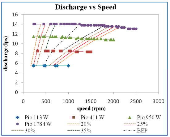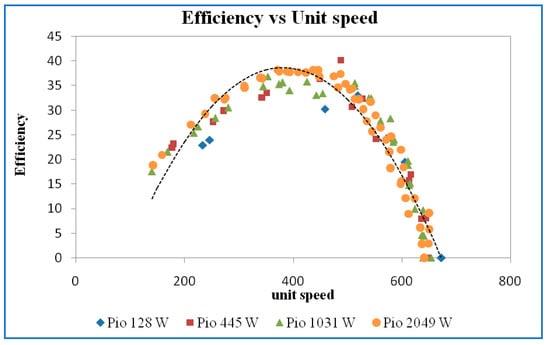 The iso-efficiency lines plotted on discharge versus speed curves are shown in Figure 11. From the efficiency curves, horizontal lines corresponding to efficiencies of 20%, 25%, 30%, 35%, and best efficiency point (BEP) were drawn and the speed and the discharge corresponding to the point where the efficiency curves intersect the horizontal iso-efficiency lines were noted and plotted, as shown in the above figure. It may be noted that the value of discharge and speed at maximum efficiency is 32%, 36%, 37%, and 38% at input power of 77 W, 243 W, 647 W, and 1414 W for guide vane opening of 10 mm.