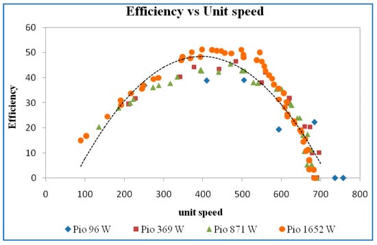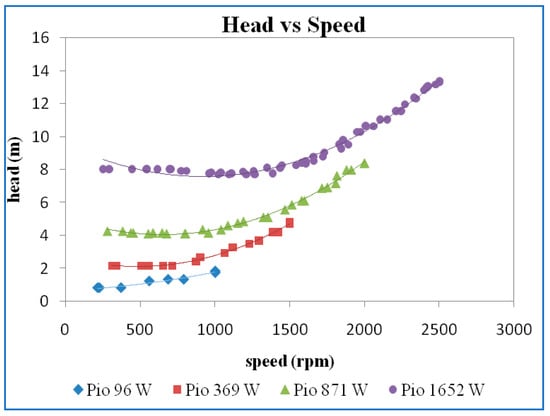 Efficiency versus speed for different power inputs is shown in Figure 7. It may be seen that higher maximum efficiency was obtained for higher inputs and efficiency increased to a maximum then decreased as speed increased. This is because the output power is contributed by the torque and speed. The speed decreases with increases in torque; thereby, the overall output power increases, reaches a maximum, and then decreases. One can argue that the effect of input power may also contribute to the variation in efficiency. This is true, but only at higher speeds. The discharge and the head were almost constant at lower speeds, so the variation of input power becomes insignificant. That is the reason that the efficiency curves show the increasing and decreasing trend.