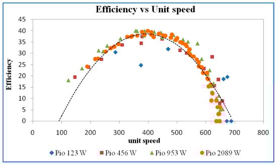 Figure 33. Efficiency vs. unit speed at a guide vane opening of 16 mm.