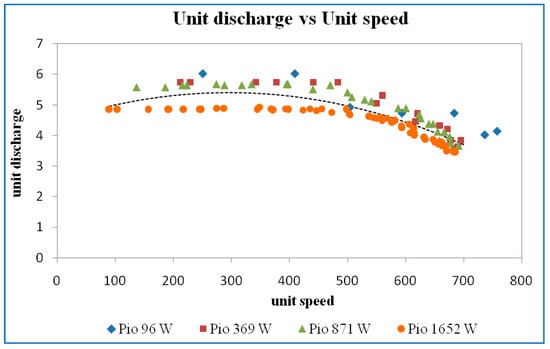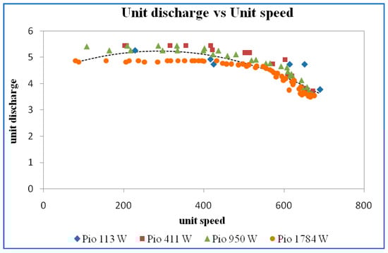 Figure 31. Unit discharge vs. unit speed at a guide vane opening of 16 mm.