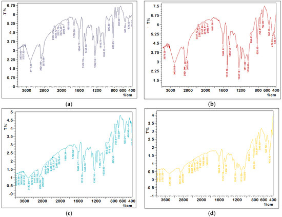 Figure 1b–d demonstrate the FTIR transmittance spectra of an epoxy/nanopowder combination with a weight proportion of 15% nanosilica, 15% nanoglass, and 15% nano–fly ash to examine the silica bands in epoxy. The study’s findings revealed that the bulk of the peak transmission could be traced back to the original epoxy. The development of new band peaks of silica may also be observed. The stretching, symmetric, and asymmetric vibrations of the siloxane set (Si-O-Si) in the silica also confirmed the network of SiO2 transmission bands at 825 cm−1 and 1111 cm−1 [30]. The Si-O-H band in silica was responsible for another new band peak at 3757 cm−1. Once nanosilica was treated with epoxy, the epoxide set would react with the SiO2 silanol set via H-bonding. The OH group stretching vibrations of epoxy resin were shifted to 3417 cm−1 for silica-reinforced epoxy [30,31], as seen from the clean epoxy resin spectra and its composites of fly ash, glass, and silica. The quantity of transmission rose with the addition of nanosilica powder and was reduced with nano–fly ash and glass powder, as shown in the figures. The interaction of radiation with the powder and the presence of absorption and dispersion causes a rise or reduction in radiation transmission.