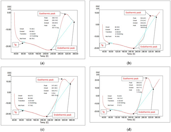 Differential scanning calorimetry (DSC) analysis: (a) neat epoxy, (b) 15% nanosilica, (c) 15% nanoglass, and (d) 15% nano–fly ash.