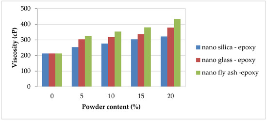 The critical element of workability properties is the complex knowledge of how additions influence the rheological properties of the polymer. The viscosity was determined for pure epoxy and nano–fly ash/epoxy, nanoglass/epoxy, and nanosilica/epoxy added in various amounts (0, 5, 10, 15, and 20 wt%) to three sets of specimens. Figure 3 depicts the viscosity of nanopowder-filled epoxy matrix composites. Increasing the powder amount from 0 to 20 cause a significant increase in the viscosity value from 212 cP to 433 cP when using of nano–fly ash epoxy, which records the highest viscosity values in comparison with other selected powders, while nanosilica epoxy records the lowest viscosity values in all selected powder ratios compared with other powders.