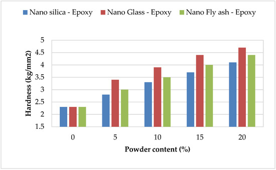 - The hardness magnitudes improve when the nanopowder filler rises, which correlates to the uniform distribution of nanosized fillers and the high adhesion between epoxy and nanopowder. The hardness magnitudes of the nanoglass/epoxy composites seemed to be likewise greater than those of the nanosilica/epoxy and fly ash/epoxy composites, which are attributable to the hardness of the nanosized glass powders as well as the strengths of the connection between the epoxy and powder.