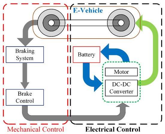 In recent years, the E-vehicle (EV) has played a vital role in the means of transport. According to the International Transport Forum [1], due to the rapid increase in urbanization, CO emissions will increase around 60% by 2050, causing global warming. One of the main reasons for the introduction of EVs is the concern about greenhouse gas emissions and their contribution to the reduction of such harmful gas emissions. EVs have a lot of potential to reduce greenhouse gas emissions. Basically, two types of EVs are used in the market: plug-in hybrid (PHEV) is majorly used, where internal combustion engines are used to run the vehicle along with EV system. An electric vehicle’s fundamental components are a battery, a DC-DC converter, a power electronic controller, and a traction motor. Similarly, smart vehicle are developed to overcome the conventional EV [2]. The smart vehicle are used with IoT-based control, and renewable- and nonrenewable-based input sources to the EVs are currently used. Additionally, mechanical speed control is widely used and studied based on clutch control [3,4], automatic transmission control [5,6], and gear shift control [3]. For efficient regenerative braking and speed transmission control, electrical control is preferred and fast. In this work, an electric-based DC-DC speed control technique is used for controlling the speed of the E-vehicle. The DC-DC converter is used for controlling the speed of the EV, and it is used for controlling other electronic devices in the EV system. For simplicity, the E-bike is considered for the discussion. For controlling the DC motor [7], a DC-DC converter is required. The switched capacitor (SC) converter possess more advantages as compared to the conventional converters because the converter only uses switches and capacitors for the conversion operation, and these converters provides high efficiency and maximum target voltages; the inductor-based converters [8] provide a good solution but have some limitations, such as EMI issues and iron losses. SC converters are widely used in many applications. High- and medium-power applications can also benefit from these switched capacitor DC-DC topologies. For the efficient conversion of DC to AC power, the output of such DC-DC converters is provided to DC-AC inverters to obtain the AC voltage by regulating the inverter with relevant PWM methods [9,10]. Renewable energy sources are connected to the grid via high- and medium-power DC-DC converters. The general converter topology is considered, i.e., single-input multiple-output (SIMO) switched-capacitor DC-DC converter is designed for speed transmission. In EV, a battery is used for the acceleration of the vehicle using the DC-DC converter, i.e., it converts the fixed DC power from the battery to the variable DC, which can be used by various parts of the circuit and to drive the DC motor in the vehicle. The SC converter is designed in such a way as to maintain the voltage ripple and maintain the negative current [2]. The main advantage of the proposed speed control system controls both the acceleration/deceleration operation for both motoring and regenerative operation also used to control different electronic components in the vehicle. In an electrical vehicle, regenerative braking also helps to extend the vehicle’s range. The kinetic energy is transformed to electrical energy during the regenerative braking cycle [11]. The driving range may be extended by using regenerative braking, which also increases the braking efficiency. Many different types of study have been conducted on regenerative braking in the recent literature [11,12,13], but the four-transmission system completely automatic controller is not mentioned in many of them. A novel four-transmission system for forwarding and regenerative operation is explored in this paper. The suggested system’s regenerative braking technology is shown in Figure 1.