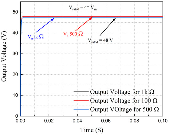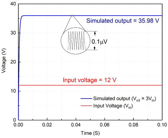 In this scenario, the electronic load is linked to all of the proposed converter’s loads. The output voltage and voltage ripple of the 4 * voltage ratio are shown in Figure 5, with a voltage ripple of 0.1 V. All of the simulated output voltages are almost identical to the model values, as shown in Figure 6. The simulated output voltage of 3 * is 35.97 V, as shown in Figure 7, and it is evident that the simulated output voltage is nearly similar to the model voltages. In addition, the load variation for the suggested converter is shown in Figure 5 by altering the resistance value from 5 k to 1 k for the voltage ratio 4 * . By comparing the findings of (), () and () values that are in excellent agreement with each other, the suggested converter is concluded.
