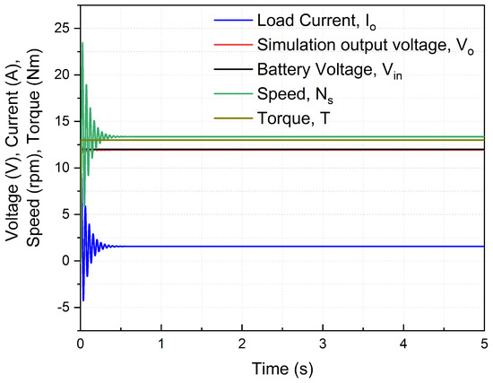 The parameters of torque, speed, and the current are assumed using and from the basic E-bike. Assumptions are made for designing the E-vehicle parameters. The parameters are as follows: motor/gear is 3 kg, controller is 0.5 kg, battery is 3 kg and the cyclist is 10 kg. Let us consider the real-time parameters of a bicycle, where the speed, is 5 km/h, is 13 Nm, is 18 W, head wind speed is 1 km/h, and, adding 2 W power to propel, is 20 W. When designing the EV, real-time factors are taken into account. Assume the EV power and torque are constant. Figure 8 depicts the proposed converter’s simulated output voltage when the load is connected to the motor. It provides the efficient results of output voltage of 11.98 V, load current of 1.68 A, torque of 13 Nm, input voltage of 12 V, and speed of 13.6 RPM. From this, it is clear that even when the motor load is connected to the proposed converter, it provides efficient operation.