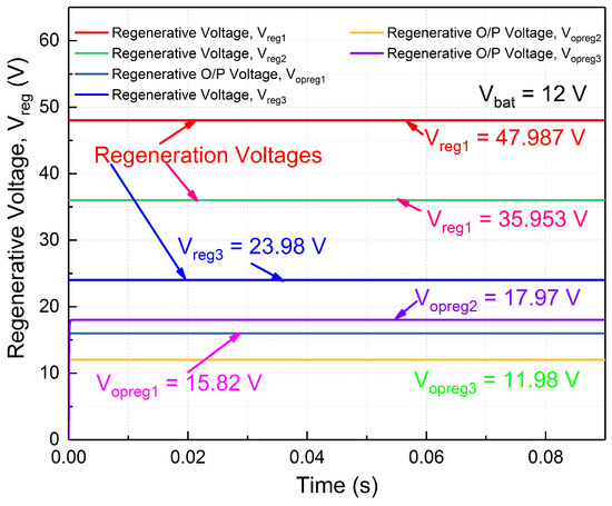 The energy from the EV is supplied back to the source during regenerative braking using the same suggested converter, which will serve as a buck operation for charging the battery utilizing different step-down voltage ratios. Let us consider (0.3 * ) voltage ratios as a regenerative voltage for the simulation and analysis, and the turn on/off switching pulse pattern for the regenerative case is shown in Table 4. If the regenerative voltage is not achieved, the target voltage 12.5 V (predefined voltage for charging a 12 V battery). The SIMO converter selects the different voltage ratios to buck the voltage for charging the battery. Figure 9 displays the simulated output voltage of the regenerative braking of proposed converter.